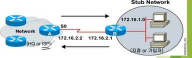 - Router B는 A뒤에 있는 네트워크에 접근하기 위해서 Router A로 보내는 Default Route를 설정함